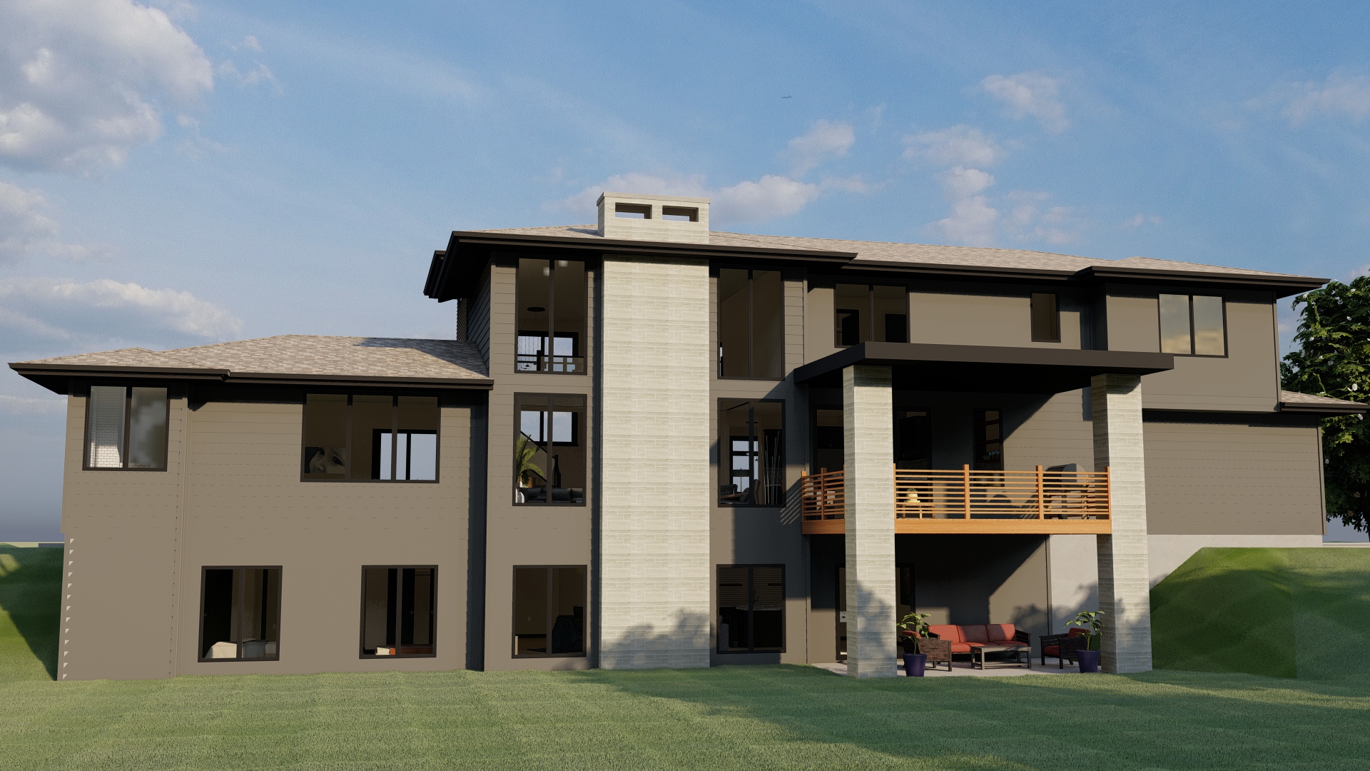 Our Elmhurst plan is a modern, prairie style design. This category of architecture features low-pitched hipped roofs with deep overhangs, horizontal lines, clusters of large windows and natural building materials. This 1.5 story is equipped with a wide front facade, statement-making chimney and end-load garage. Get ready to be impressed! Stepping through the front doors you’ll find a two-story entry and living room with a main hall and impressive staircase. The main floor includes an open-concept great room, kitchen and dining. You’ll also find a large, walk-in pantry and the primary suite with an oversized, walk-in closet. Upstairs you’ll find three bedrooms, a large bathroom, and laundry room.The basement features a fifth bedroom and sixth bedroom, wet bar and large living space.